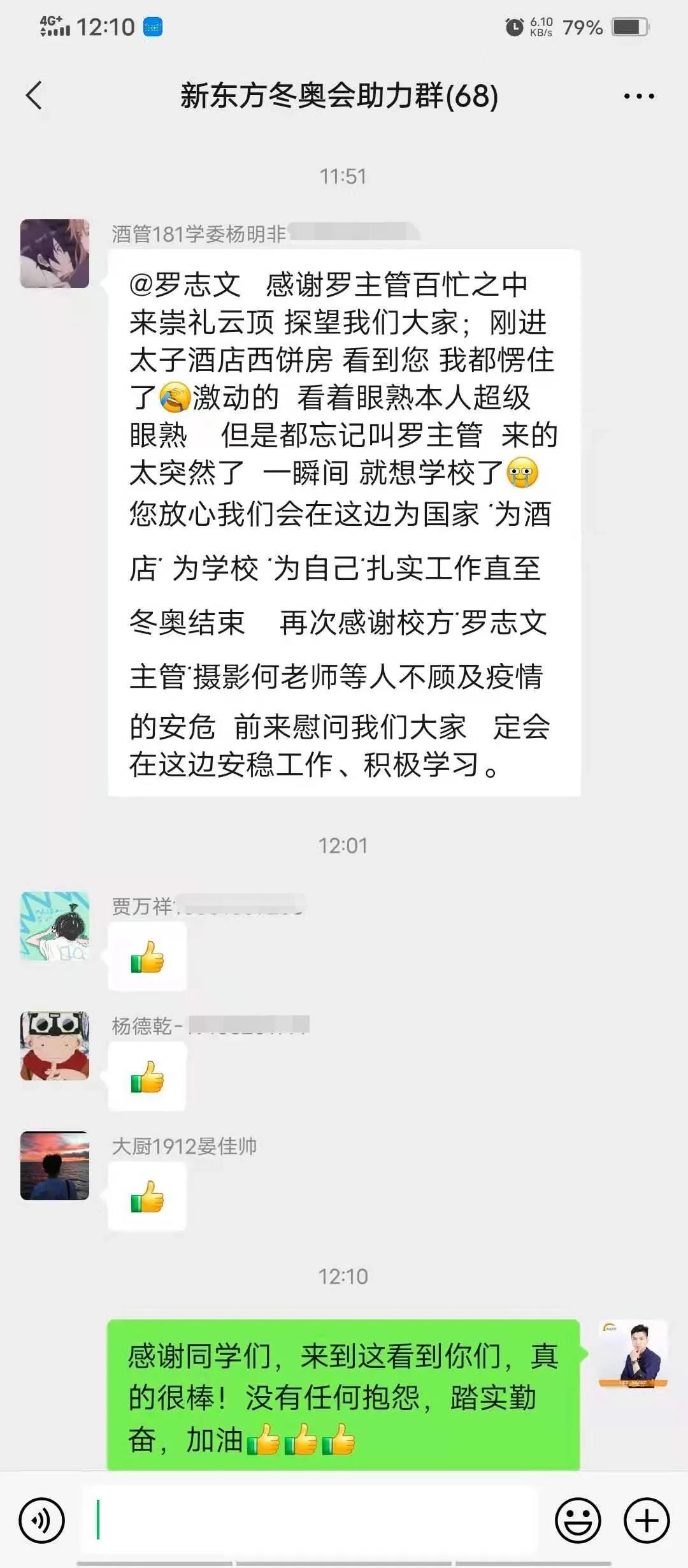 座談結(jié)束后,校專程來到同學(xué)們工作的地點,看望了正在工作中的同學(xué)們,并鼓勵大家要全身心的投入到服務(wù)之中,嚴(yán)格防控,加強(qiáng)自身的學(xué)習(xí),以更加昂揚(yáng)的精風(fēng)貌在北京2022冬奧會中展現(xiàn)河北新東方學(xué)子的青春風(fēng)采!校的關(guān)懷和鼓勵令大家備受鼓舞,大家紛紛表示,將繼續(xù)努力,珍惜機(jī)會,保質(zhì)保量的完成本次任務(wù)。